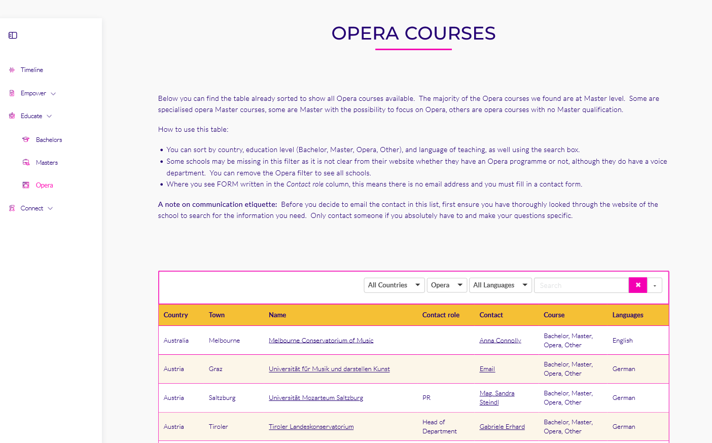 Empower yourself with new skills by diving into one of our courses such as: How to apply for a Bachelor/Master or The Singer’s Toolbox. Read curated articles and interviews with professionals in the field, and use our templates and resources pages to help you with your CVs, goal setting and industry awareness.