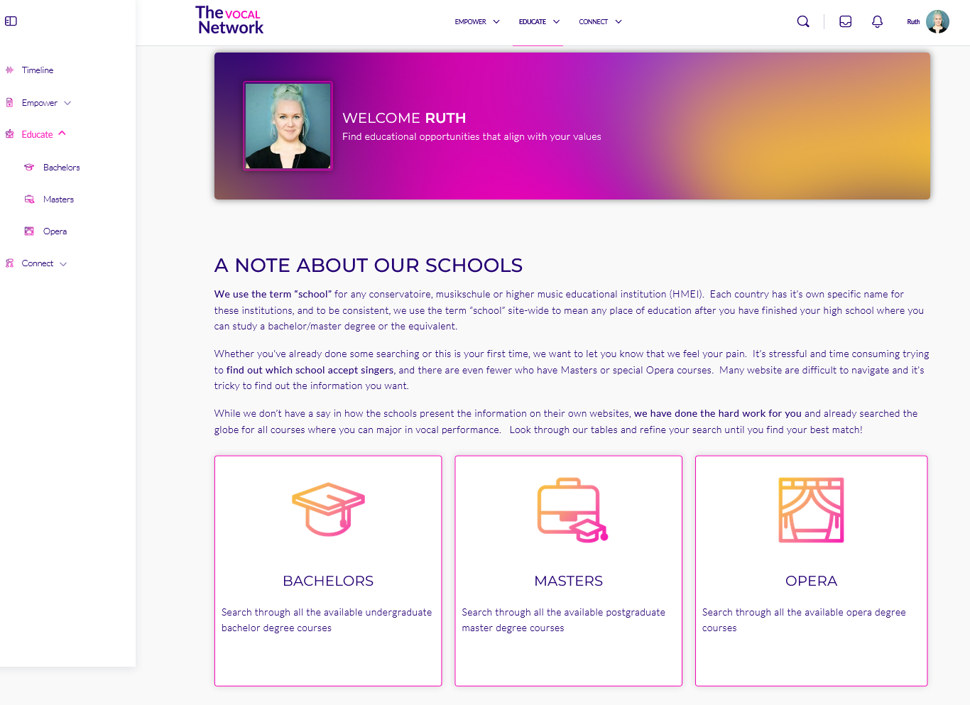 Empowering aspiring vocal professionals to explore their study and career options, and create their individual journey by informing, educating and fostering connections through our content packed platform and global network.